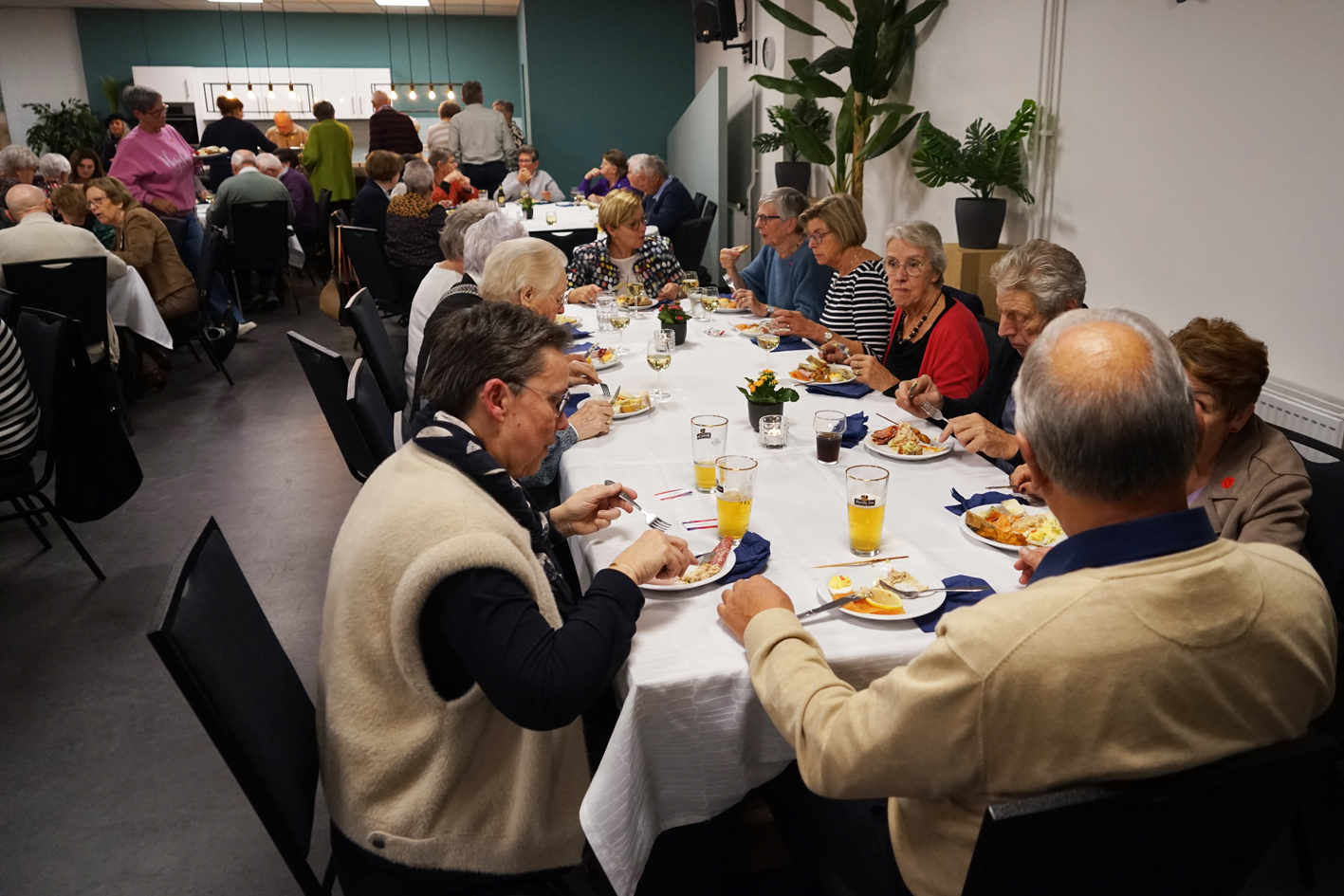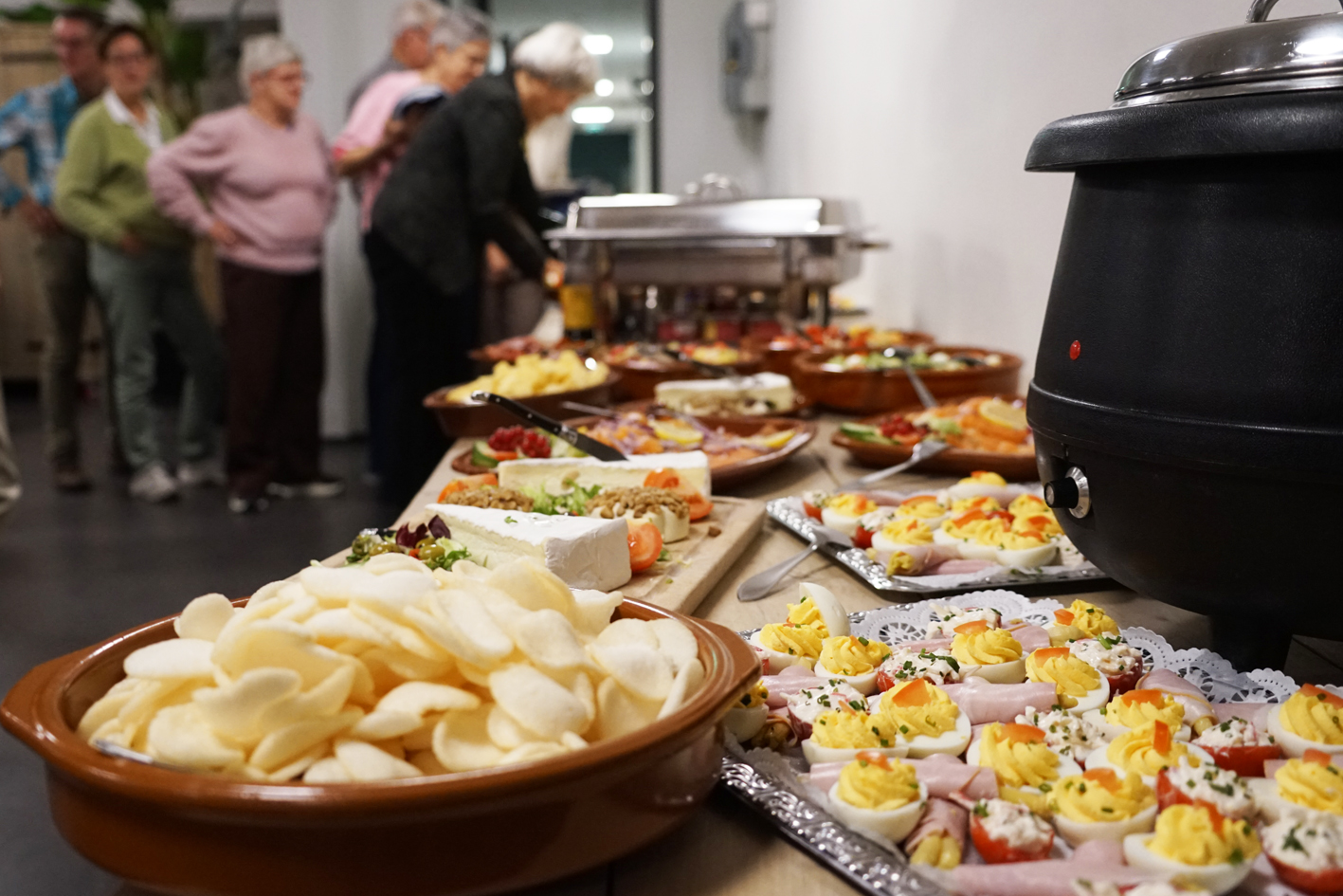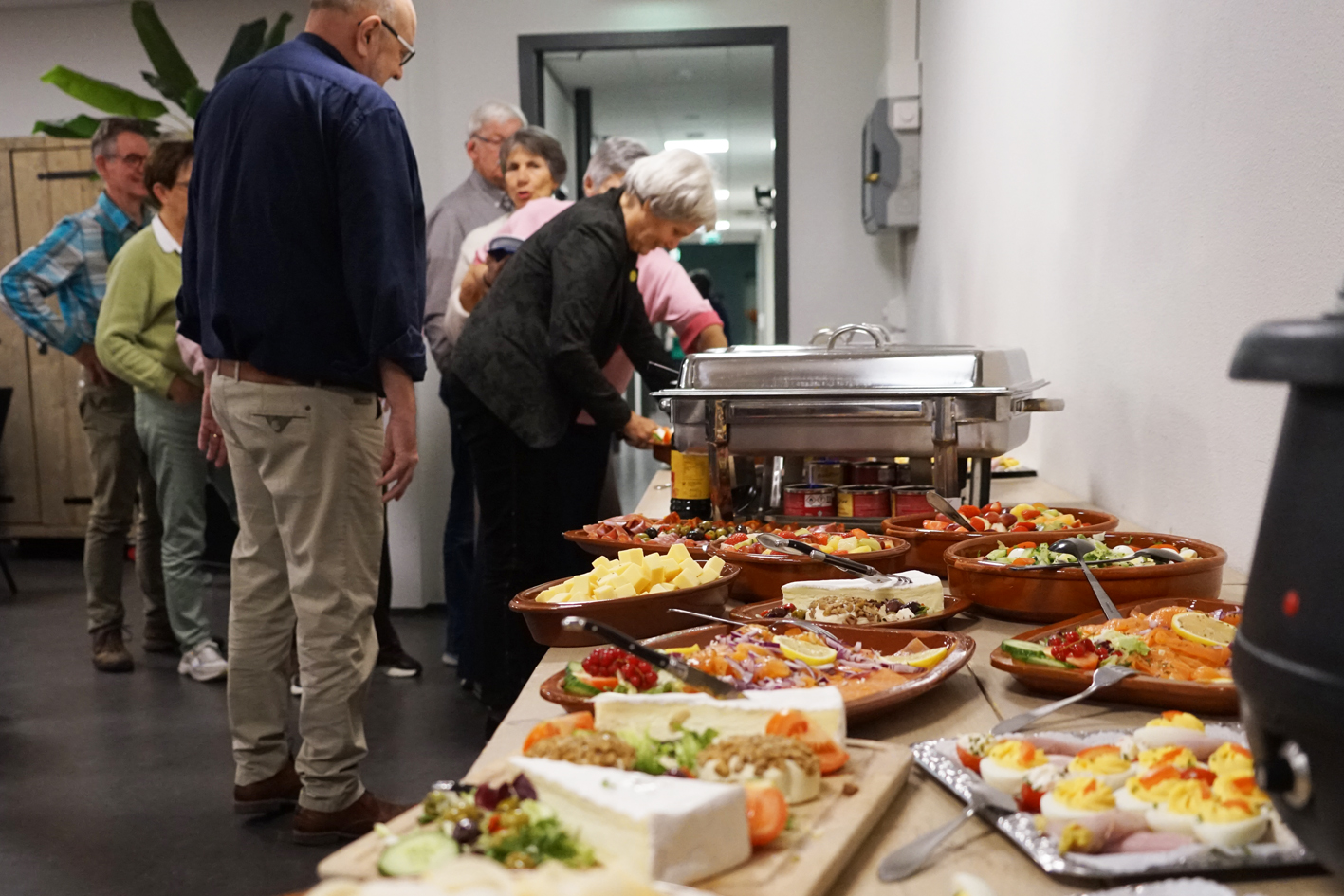 Halverwege de show was een pauze ingepland, waar koffie/thee met een appelflap werd uitgedeeld. Na de voorstelling kon er nog gezellig nagepraat worden in de foyer van De Boodschap. De vrijwilligers konden daarna aanschuiven voor een uitgebreid en overheerlijk warm en koud buffet.