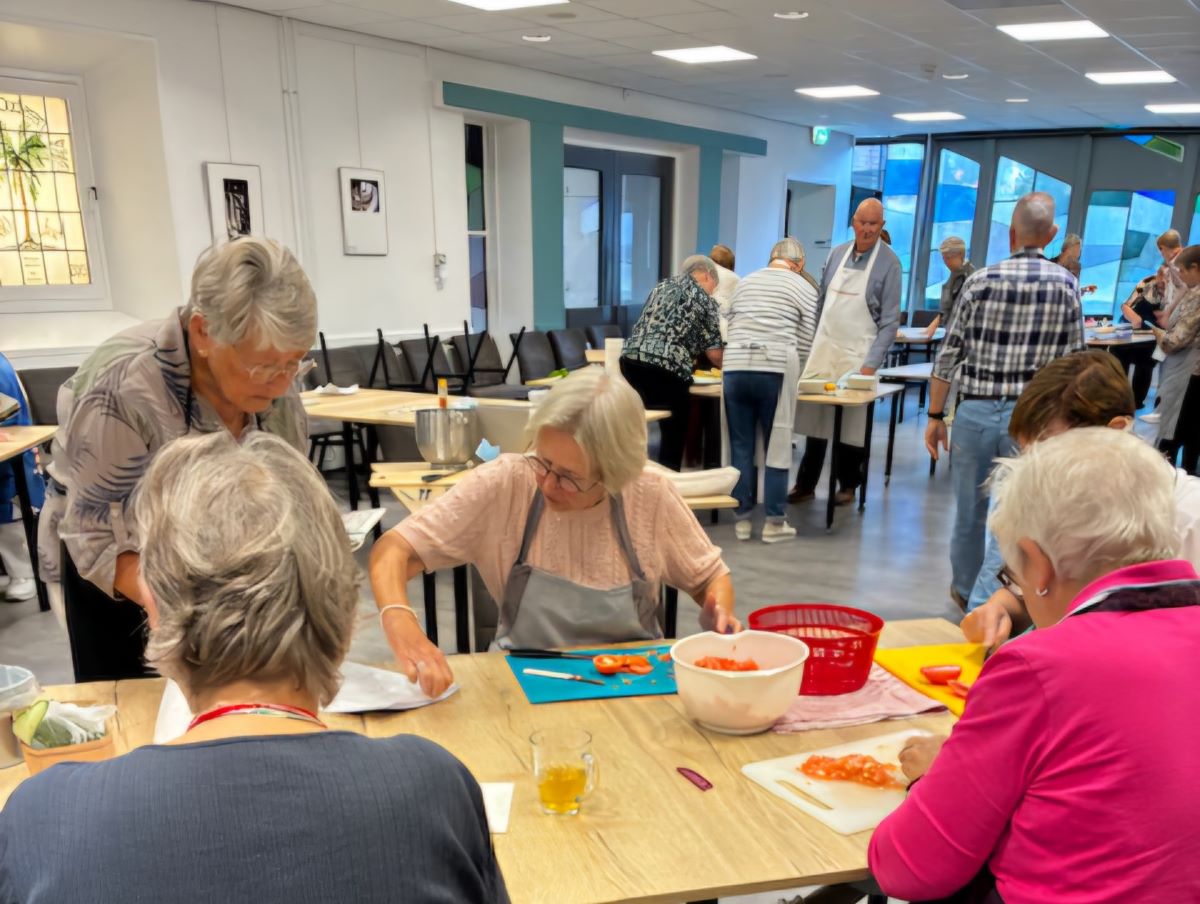 Alles stond in de Oase klaar, netjes verdeeld aan negen tafels, per tafel stond een krat met het desbetreffende recept en spullen die daarvoor nodig waren. Drie personen per tafel; het was een lust voor het oog en iedereen had zin om te beginnen.