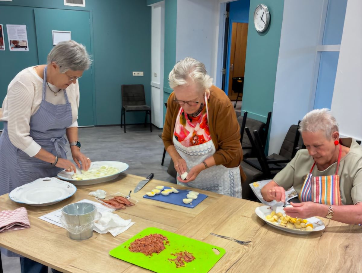 Rond de klok van twaalf uur was iedereen aanwezig en begonnen we met koffie en een Brabants worstenbroodje. Truus Noij heette ons allemaal welkom en vertelde wat de bedoeling was van deze middag. Onze koks van de activiteitengroep ‘koken voor mannen’ waren bereid om aan de dames en heren een workshop ‘hapjes maken’ te geven.
