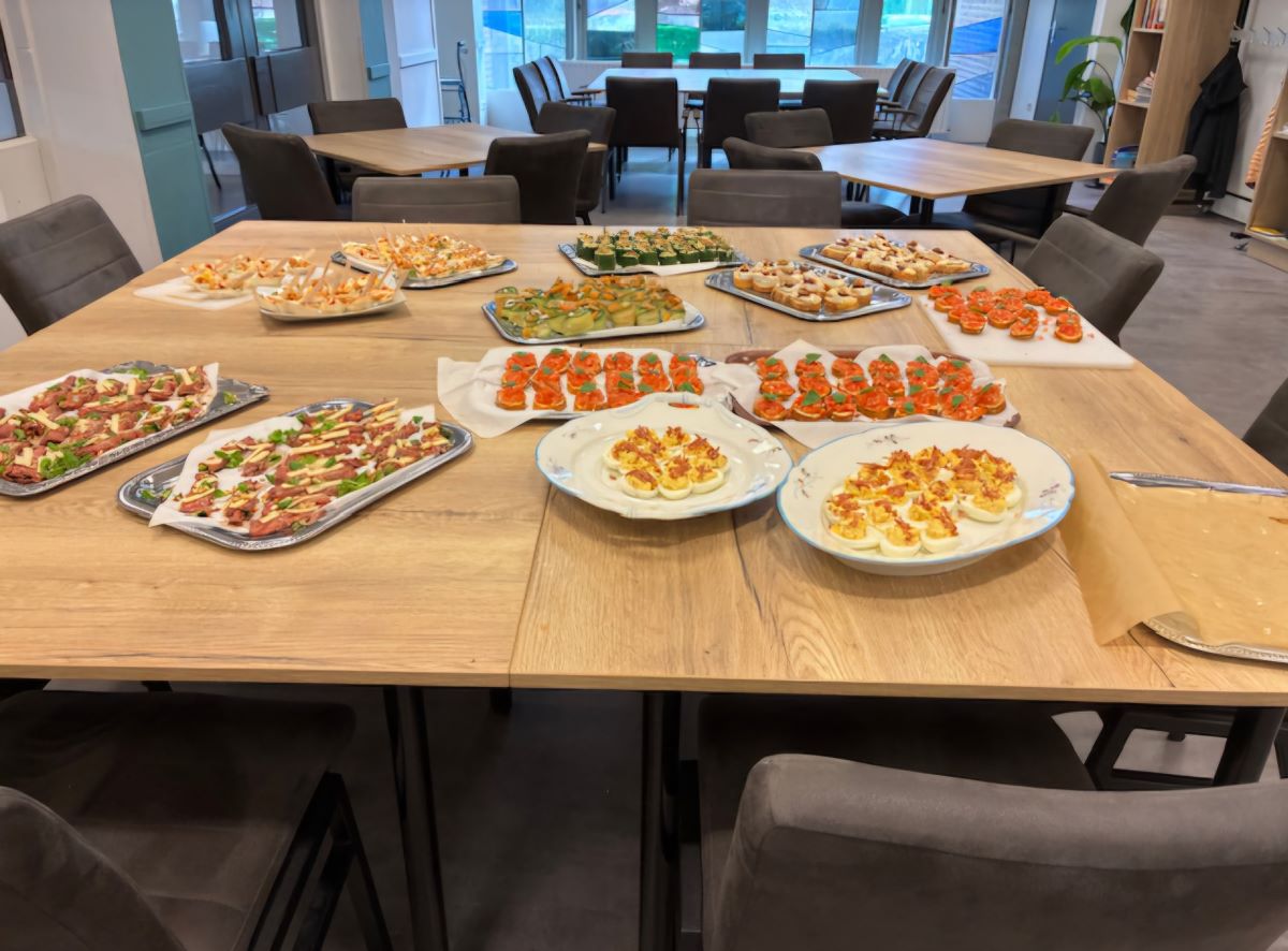 Na ongeveer twee uur was iedereen klaar en werd er een rondje gedaan om te kijken wat er gemaakt was. Het zag er allemaal overheerlijk uit. Hierna hebben wij met z’n allen alles opgeruimd en gezellige zitjes gemaakt, zodat we onder het genot van één of meerdere drankjes van onze zelfgemaakte hapjes konden genieten en wat bijkletsen.