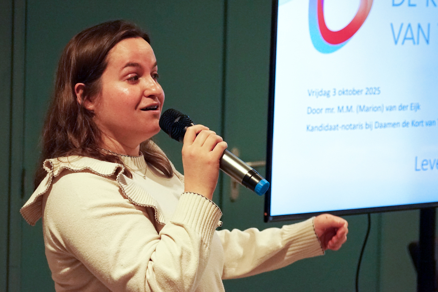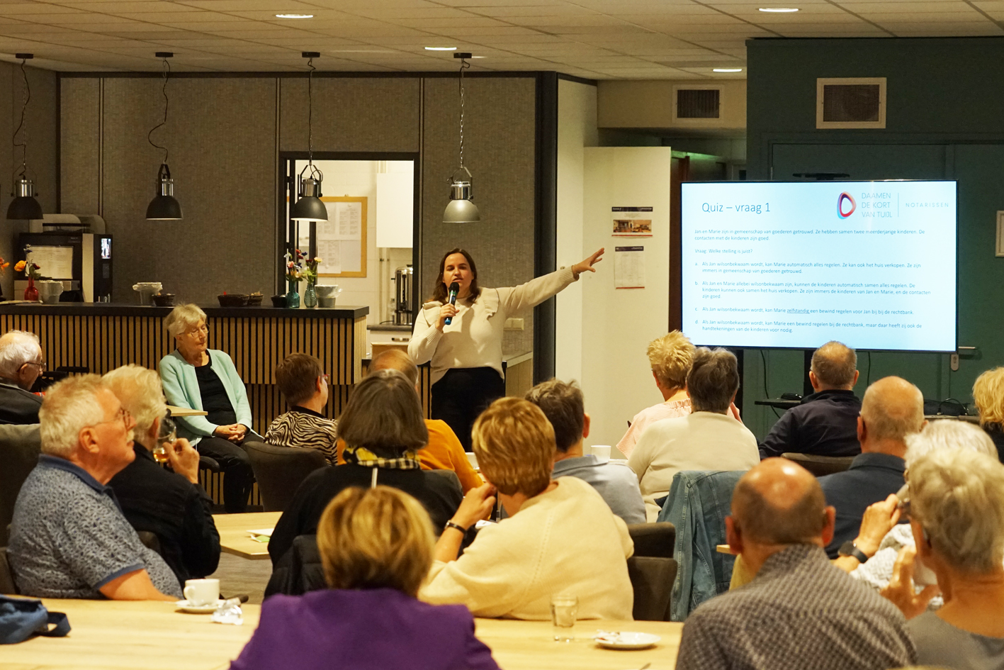 De eerste spreker was kandidaat notaris Marion van der Eijk, van het notariskantoor: Daamen, de Kort en van Tuijl. Zij bleek goed op de hoogte in erfrecht en levenstestamenten. Ze begon met het geven van diverse stellingen, waarbij de aanwezigen werden betrokken om keuzes te maken. Daarna wist zij met een heldere presentatie, doorspekt met voorbeelden uit de praktijk, de aandacht vast te houden.