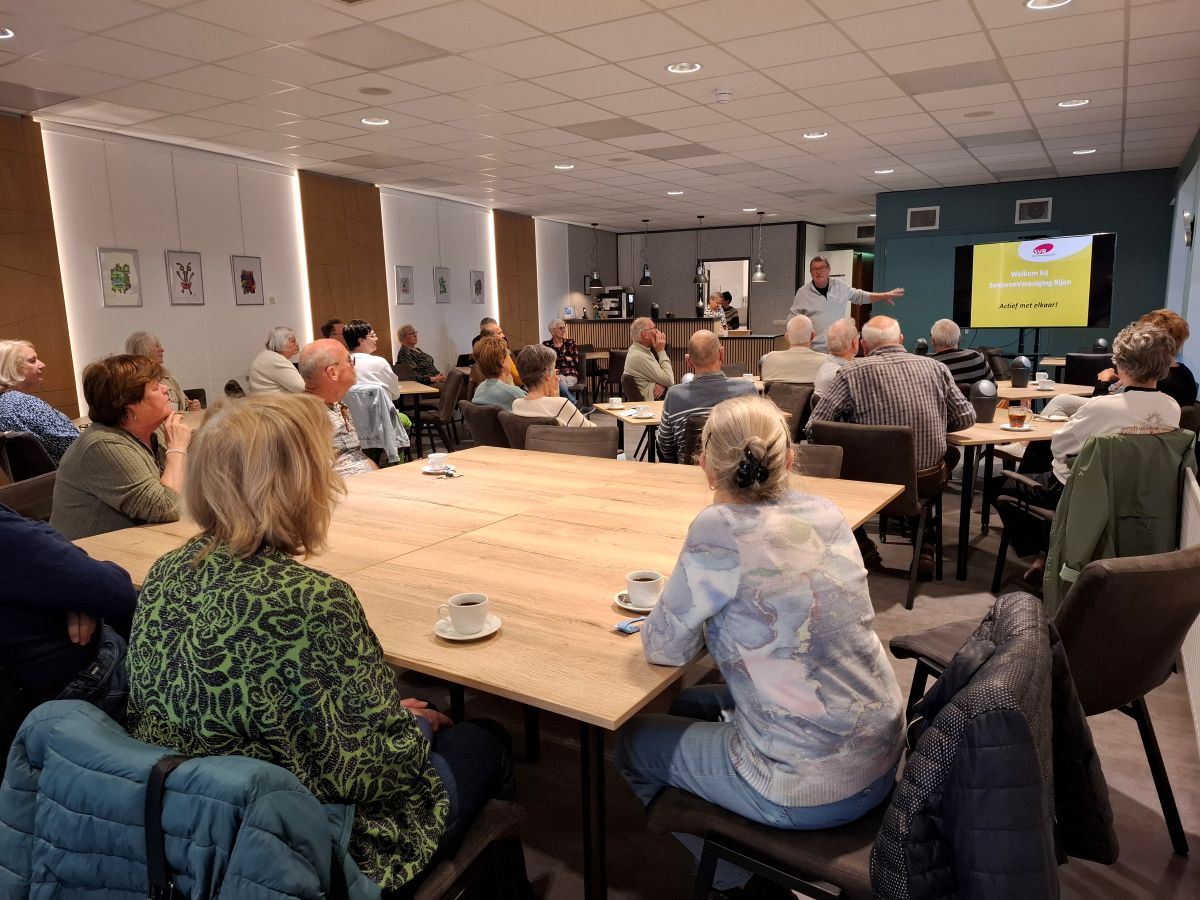 Tegen half elf was de Oase goed gevuld met nieuwe leden die uitgenodigd waren om meer te weten te komen over het reilen en zeilen van de SVR. Na een kopje koffie legde voorzitter Johan Kamp, aan de hand van een PowerPoint presentatie, alles uit over onze actieve vereniging en het overkoepelend orgaan Senioren Brabant-Zeeland (voorheen KBO-Brabant). Dat de laptop aanvankelijk sneller wilde gaan dan Johan zijn bedoeling was, kon de pret niet drukken.