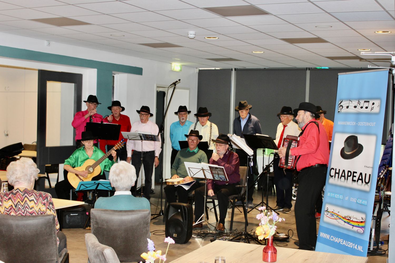 Om 14.00 uur begon het muzikale hoogtepunt van de dag: het Oosterhoutse Mannen Ensemble ‘Chapeau’ trad op. Het ensemble bracht een gevarieerd repertoire met gezellige, vrolijke, maar ook melancholieke en gevoelige liederen. De sfeer zat er goed in: er werd volop meegezongen en meegeklapt. Sommige liederen riepen herinneringen op aan vroeger, wat zorgde voor ontroerende momenten. Het ensemble wist de zaal te raken en bracht een glimlach op het gezicht van veel aanwezigen.