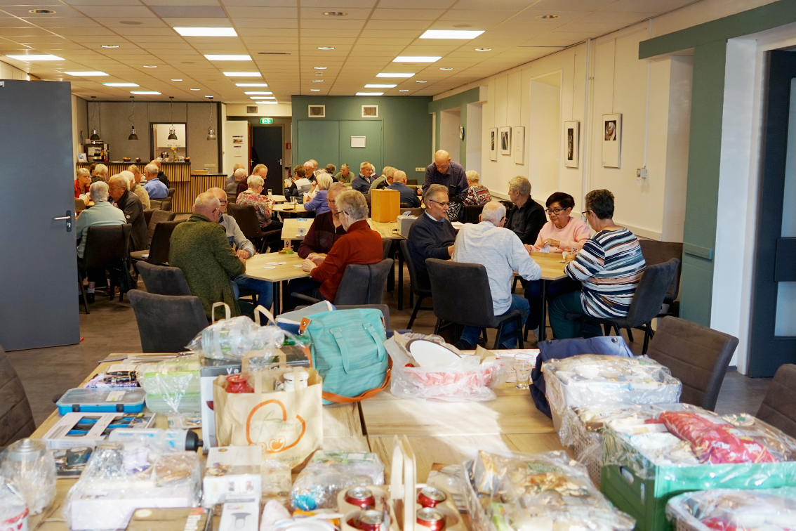 Als ik in de Oase aankom is Piet Lodewijks druk bezig met het plaatsen van de tafels. Ook de prijzentafel is al ‘opgetuigd’. Een veelheid aan prijzen ligt op prijswinnaars te wachten. Er is voor elk wat wils. Van voedselpakketten (5 stuks zelfs) tot cadeaubonnen, gereedschapssets, een schilderij van Jan van Dijk en huishoudelijke hebbedingetjes.