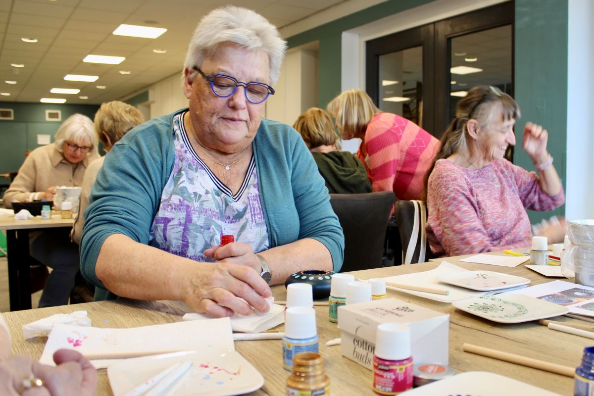 Dertien creatieve dames gingen voorzichtig aan het werk. En met minder kleurgebruik dan ze gewend waren. Een stip die erop stond kon er niet meer af, dus moest er heel nauwkeurig gewerkt worden.