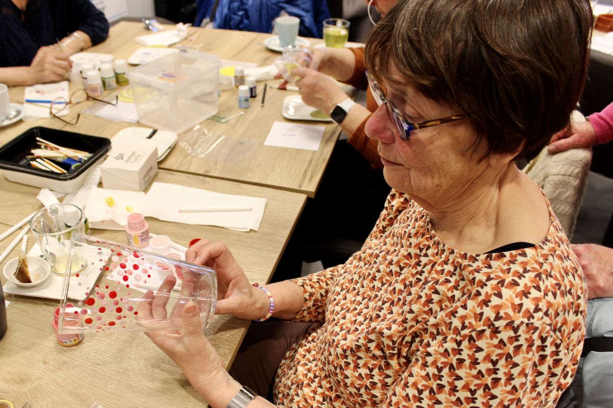Marian van Kessel keek terug op een geslaagde middag: “Nog nooit hebben we zo’n grote variatie aangeboden aan stipwerk. Er was Staphorster stipwerk en er kon op diverse dingen gestipt worden met porseleinverf. Dit is met verschillende verf, daarom hebben we deze twee groepen van elkaar gescheiden om hen voldoende aandacht te kunnen geven. Voor de mensen die een schort gingen stippen was het een eerste kennismaking met Staphorster stipwerk. Enthousiast zijn ze aan de slag gegaan en zij lieten na afloop weten dat ze hopen dat er nog een keer een workshop komt. Voor de mensen die aan de gang gingen met porseleinverf waren er glazen vazen, porseleinen bordjes en leistenen onderzetters. Alles moet naderhand nog wel thuis afgebakken worden in de gewone oven. Het is even wat werk, maar dan heb je ook wel iets bijzonders in huis.”