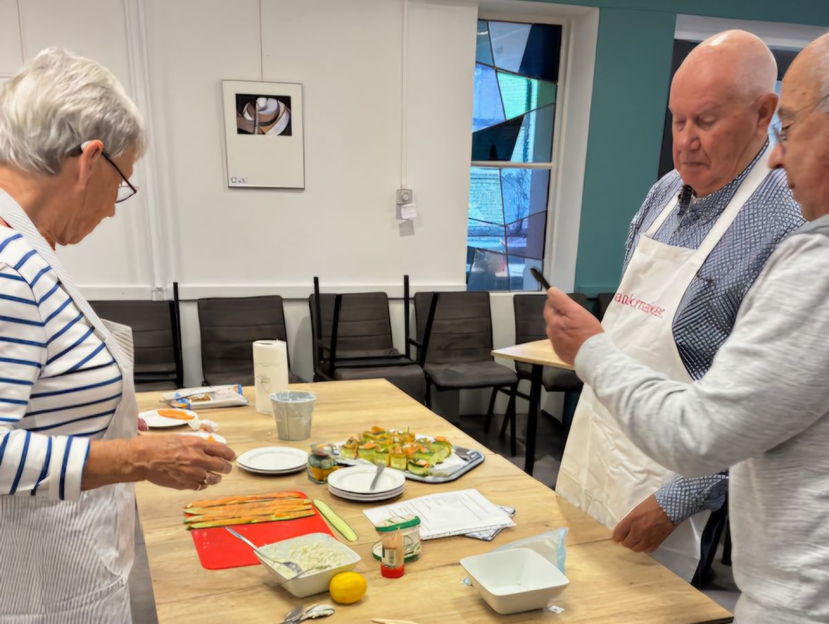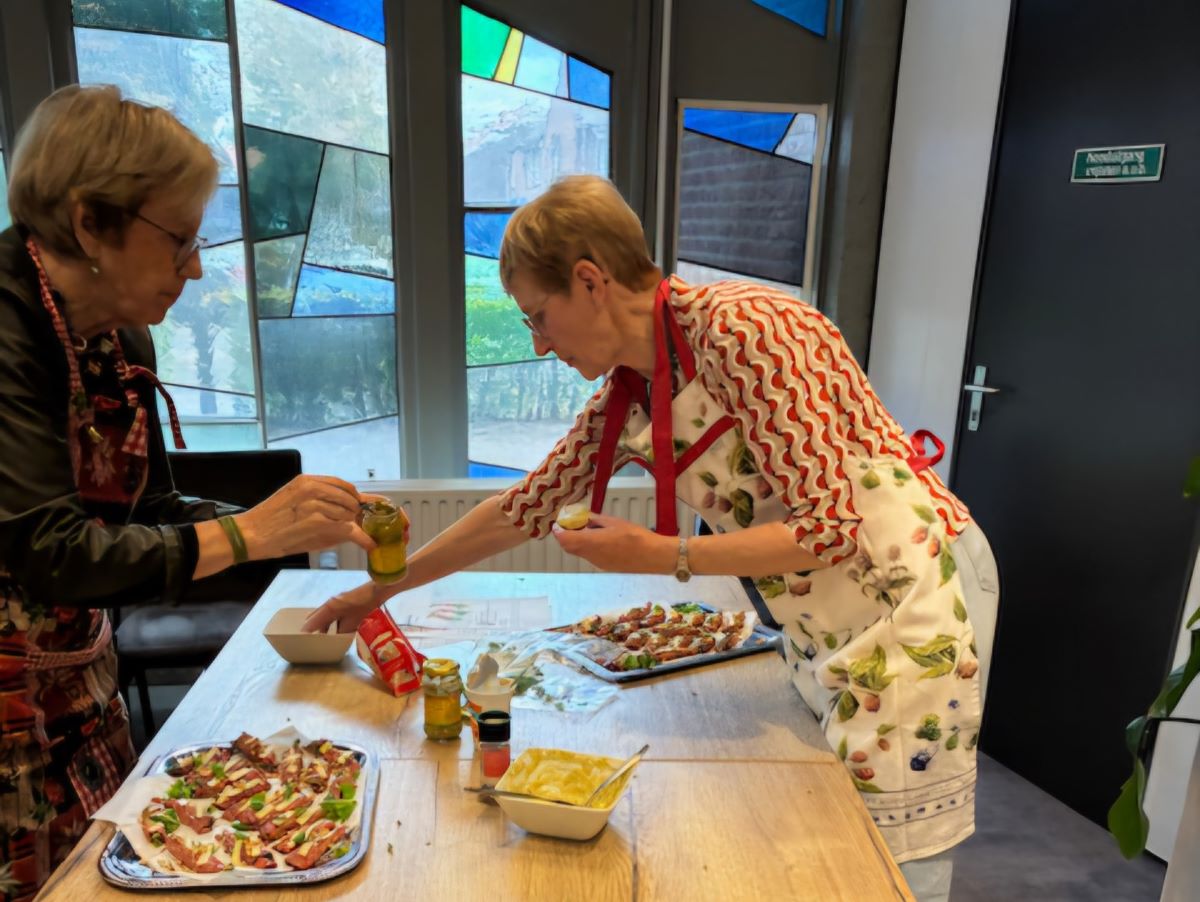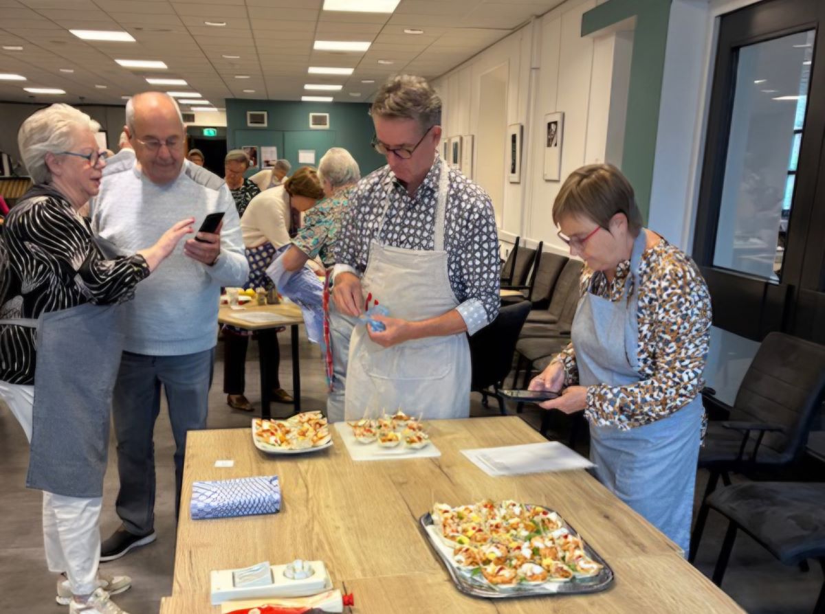 Rond de klok van twaalf uur was iedereen aanwezig en begonnen we met koffie en een Brabants worstenbroodje. Truus Noij heette ons allemaal welkom en vertelde wat de bedoeling was van deze middag. Onze koks van de activiteitengroep ‘koken voor mannen’ waren bereid om aan de dames en heren een workshop ‘hapjes maken’ te geven.