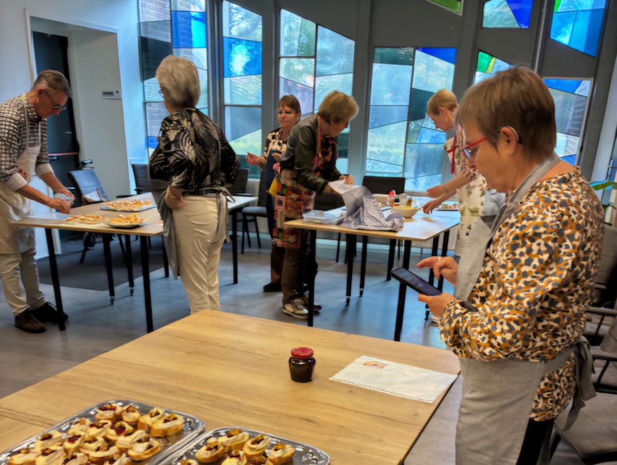 Alles stond in de Oase klaar, netjes verdeeld aan negen tafels, per tafel stond een krat met het desbetreffende recept en spullen die daarvoor nodig waren. Drie personen per tafel; het was een lust voor het oog en iedereen had zin om te beginnen.