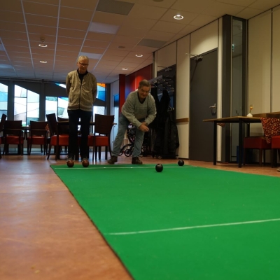 Rond 13.30 uur kwamen vier geïnteresseerden naar de Oase. De lange groene mat werd uitgerold. De nieuwelingen kregen eerst uitleg over het spel. De bal moet op een bepaalde manier gerold worden, omdat het zwaartepunt van de bal niet in het midden zit. Daarna werd er geoefend.