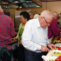 Afhalen bij de Chinees? Koken uit een pakje? Nee, daar doen ze hier niet aan. De deelnemers aan de cursus "Themakoken" leerden de basistechnieken die aan de bereiding van nassi goreng en atjar ten grondslag liggen. Carla Busselaaar liet zien hoe het moest en liet proeven hoe het moest smaken. En toen ging men in tweetallen aan de slag. Hoe kook je je rijst zorgvuldig? Welke ingrediënten heb je verder nog nodig?. Welke groenten en kruiden? En hoe zorg je dat het een smakelijk gerecht wordt? Onder de bezielende leiding van Carla Busselaar slaagden onze koks erin een heerlijk Indisch menu te bereiden.