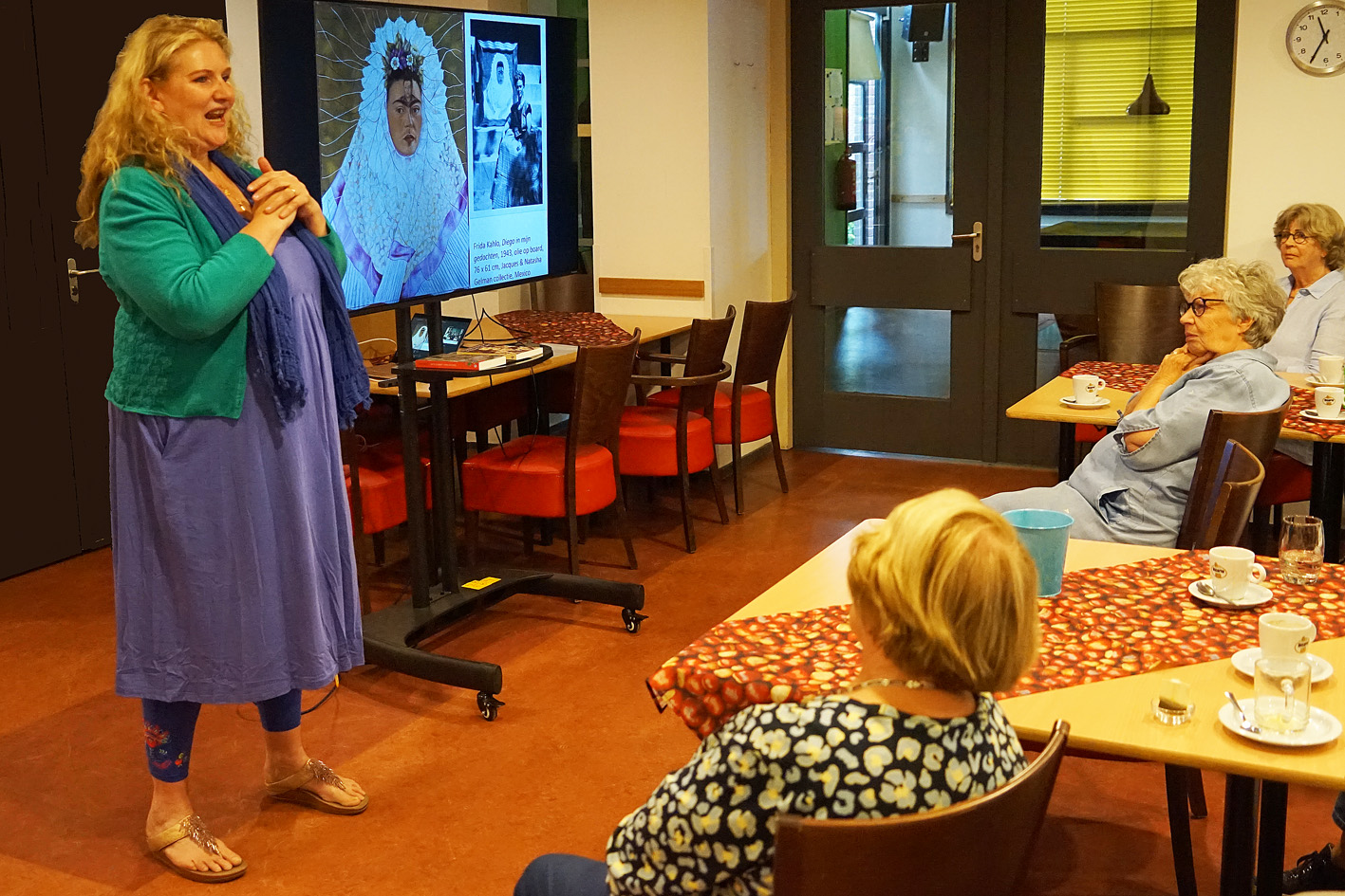 De lezing werd zó boeiend gegeven door Karin -de aanwezigen hingen aan haar lippen-, dat de pijn en het verdriet van Frida Kahlo door de senioren bijna zelf gevoeld werd. Wij kunnen ons nauwelijks voorstellen hoeveel doorzettingsvermogen deze schilderes gehad moet hebben. Helaas stierf Frida kort na haar 47ste verjaardag. Op het laatste kunstwerk dat ze maakte, schilderde ze nog de woorden ‘Viva la Vida!'