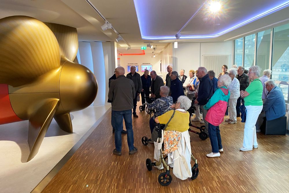 Weer werd de groep opgesplitst in kleinere groepen en onder leiding van een gids gingen we naar het bezoekerscentrum. Uit de reisbeschrijving wisten we al dat de Meyer Werf in Papenburg synoniem is voor de bouw van grote cruiseschepen. Zo hoorden we dat de Meyer Werft GmbH in 1795 is gesticht en in de 6de generatie in familiebezit kwam. Sinds 1985 is de werf overgestapt op het bouwen van luxe cruiseschepen. Er werken zo’n 2.500 mensen. Zo bleek dat inmiddels al 32 luxe schepen het dok verlaten. Elke keer weer, trekt het van stapel lopen van zo’n reusachtig schip en de tocht over de kleine rivier Ems naar de Noordzee talrijke bezoekers. Aan de hand van tentoonstellingsstukken, films en compleet ingerichte hutten werd ons de wereld van de cruiseschepen aanschouwelijk gepresenteerd. Elk jaar komen zo’n 300.000 bezoekers naar Papenburg om van dichtbij mee te maken hoe moderne scheepsbouw tegenwoordig functioneert.