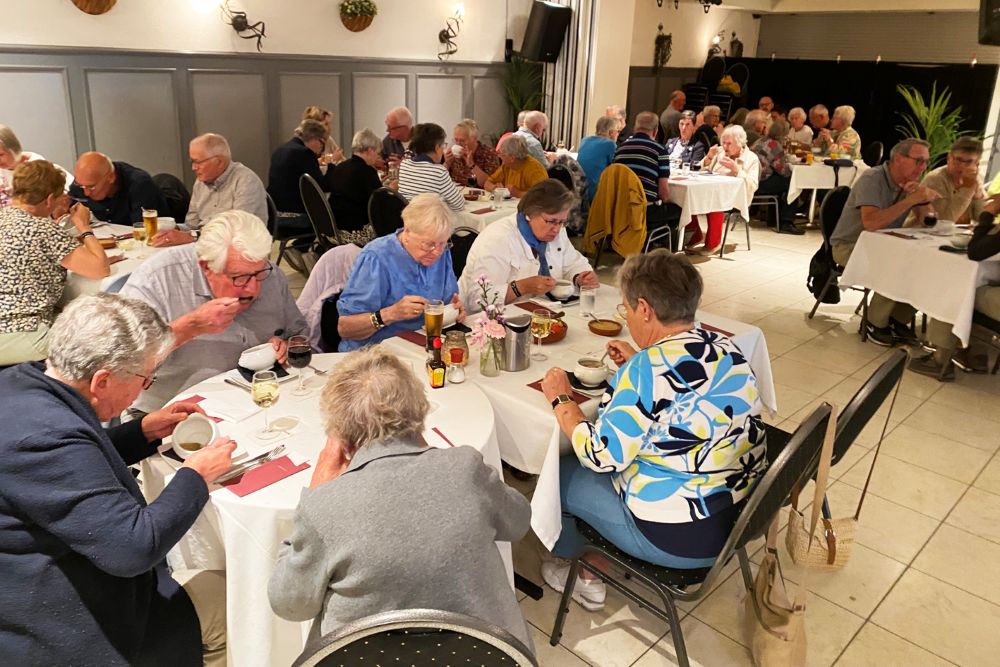 Na een voorspoedige terugreis arriveerden we in Dongen om deze boeiende reis gezellig met elkaar af te sluiten. En gezellig werd het. Een heerlijk diner en jawel…buiten vakkundig omgaan met een grote bus, ontpopte onze chauffeur/reisleider Adrie de laat zich als een ware entertainer. Adrie greep de microfoon en ‘Sweet Caroline’ vulde de ruimte. Spontaan, warm en onvergetelijk. De groep van Seniorenvereniging Gilze, die in dezelfde week naar Leeuwarden waren geweest, dineerden toevallig tegelijkertijd in hetzelfde restaurant als wij. Collega buschauffeur, John, kwam met gitaar de muzikale omlijsting verzorgen. Zo werden menige Hollandse hits door de senioren meegezongen.
