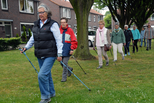 Eerst gaf de instructeur uitleg over het gebruik van de stokken. Bij voorbeeld: hoe houd je die vast? Daarna vertrok de groep naar de overkant om op het grasveld de eerste stappen te zetten met de stokken. Meeslepen en loslaten, het was allemaal opletten geblazen en in eerste instantie moeilijker dan gedacht. Het werd dan ook stil in de groep want de ‘stokkers’ moesten de aandacht er goed bijhouden.