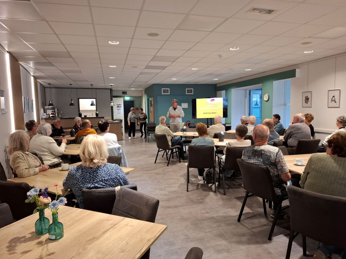Tegen half elf was de Oase goed gevuld met nieuwe leden die uitgenodigd waren om meer te weten te komen over het reilen en zeilen van de SVR. Na een kopje koffie legde voorzitter Johan Kamp, aan de hand van een PowerPoint presentatie, alles uit over onze actieve vereniging en het overkoepelend orgaan Senioren Brabant-Zeeland (voorheen KBO-Brabant). Dat de laptop aanvankelijk sneller wilde gaan dan Johan zijn bedoeling was, kon de pret niet drukken.
