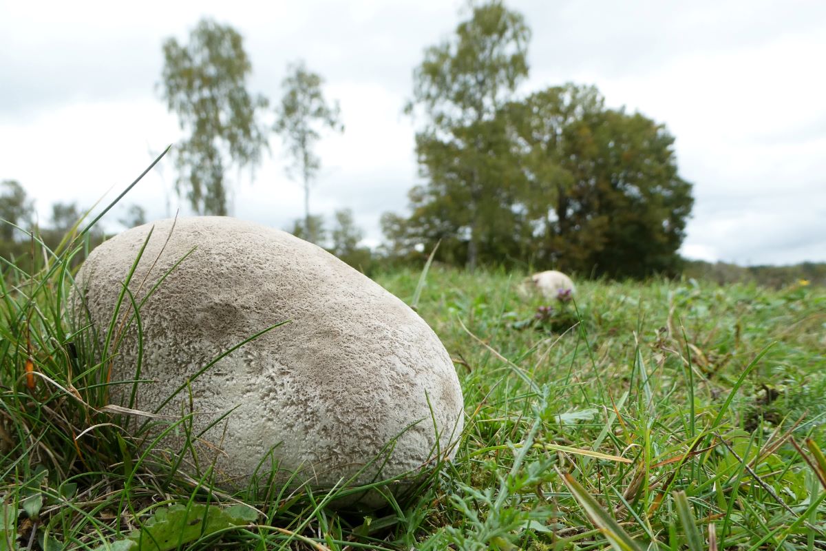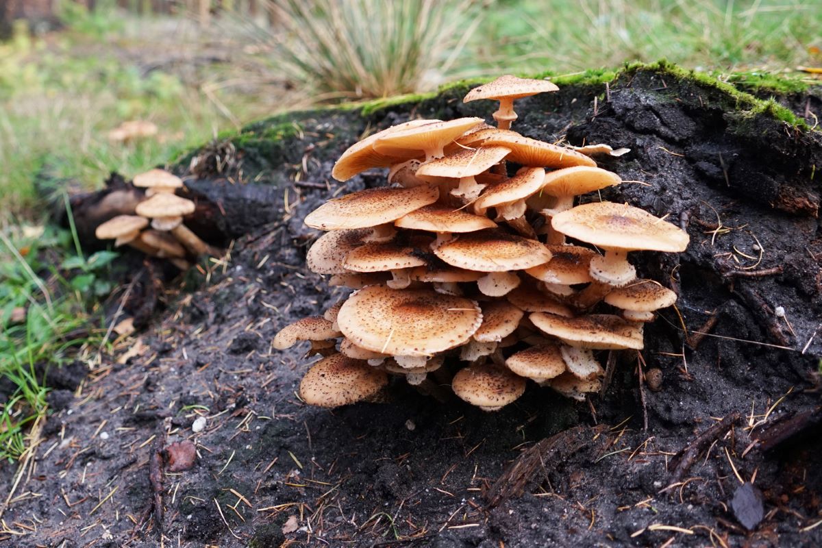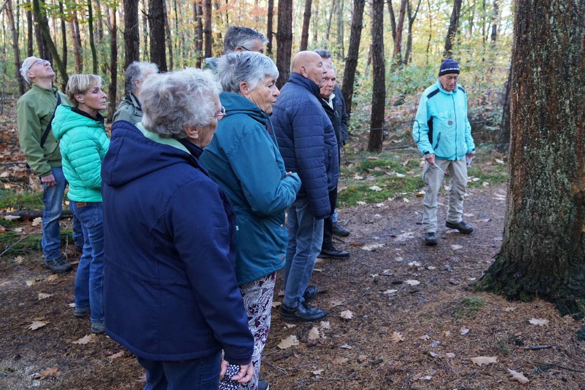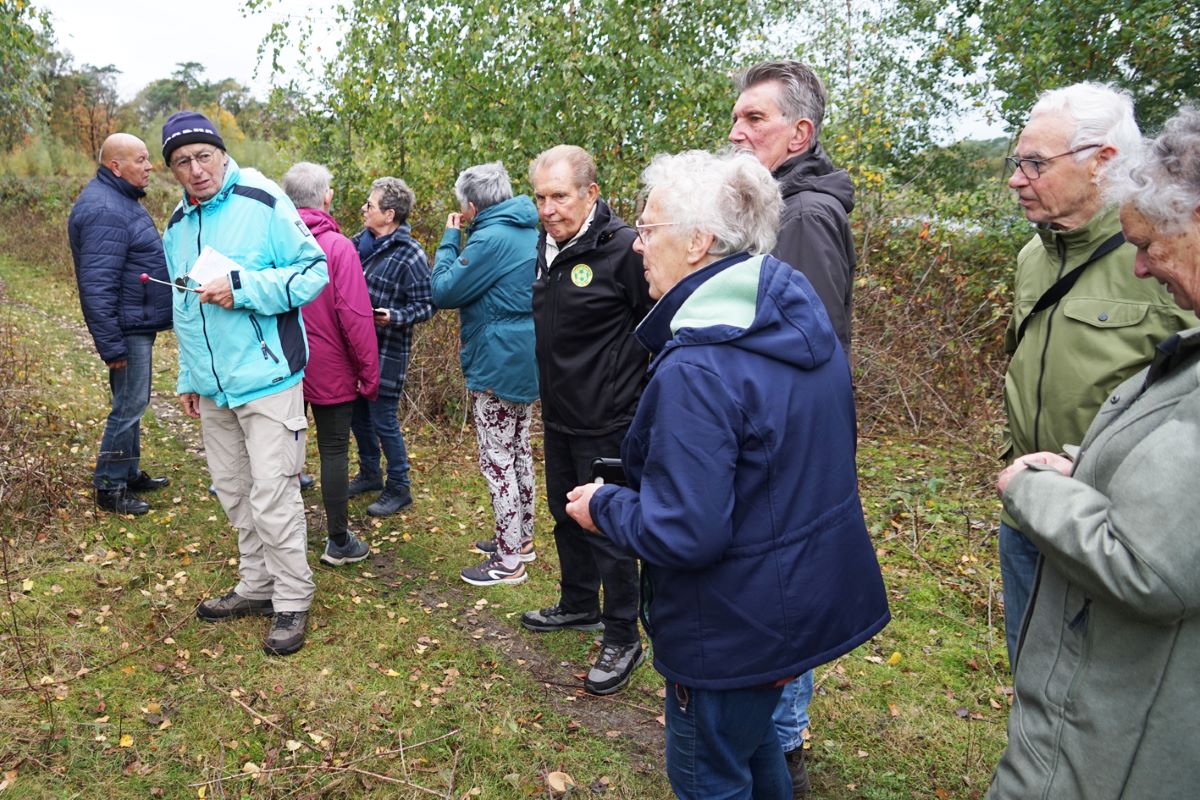 Frans Jonkers is vanochtend onze gids. Hij verwelkomt de wandelaars en vertelt dat Willem Post, de tweede gids, helaas onlangs is overleden. Frans zal daarom de groep vandaag in z’n eentje begeleiden. Met 15 senioren gaat hij op pad. Vanuit de Leemput gaan we rechtsaf het bos in. We zien daar al direct de eerste bijzondere paddenstoelen, de aardsterren. Al gauw komen we ook bekendere soorten tegen. We zien onder andere vliegenzwammen, eekhoorntjesbrood, rood gerande houtzwammen, zwavelkopjes, heel veel honingzwammen en parasolzwammen. Helaas vinden we dit jaar geen rosella’s, aardappelbovisten en parelstuifzwammen. We zien ook maar één koraalzwammetje. Dat was vorig jaar wel anders. Gelukkig heeft de fotograaf vorige week nog wel een aardappelbovist weten vast te leggen.