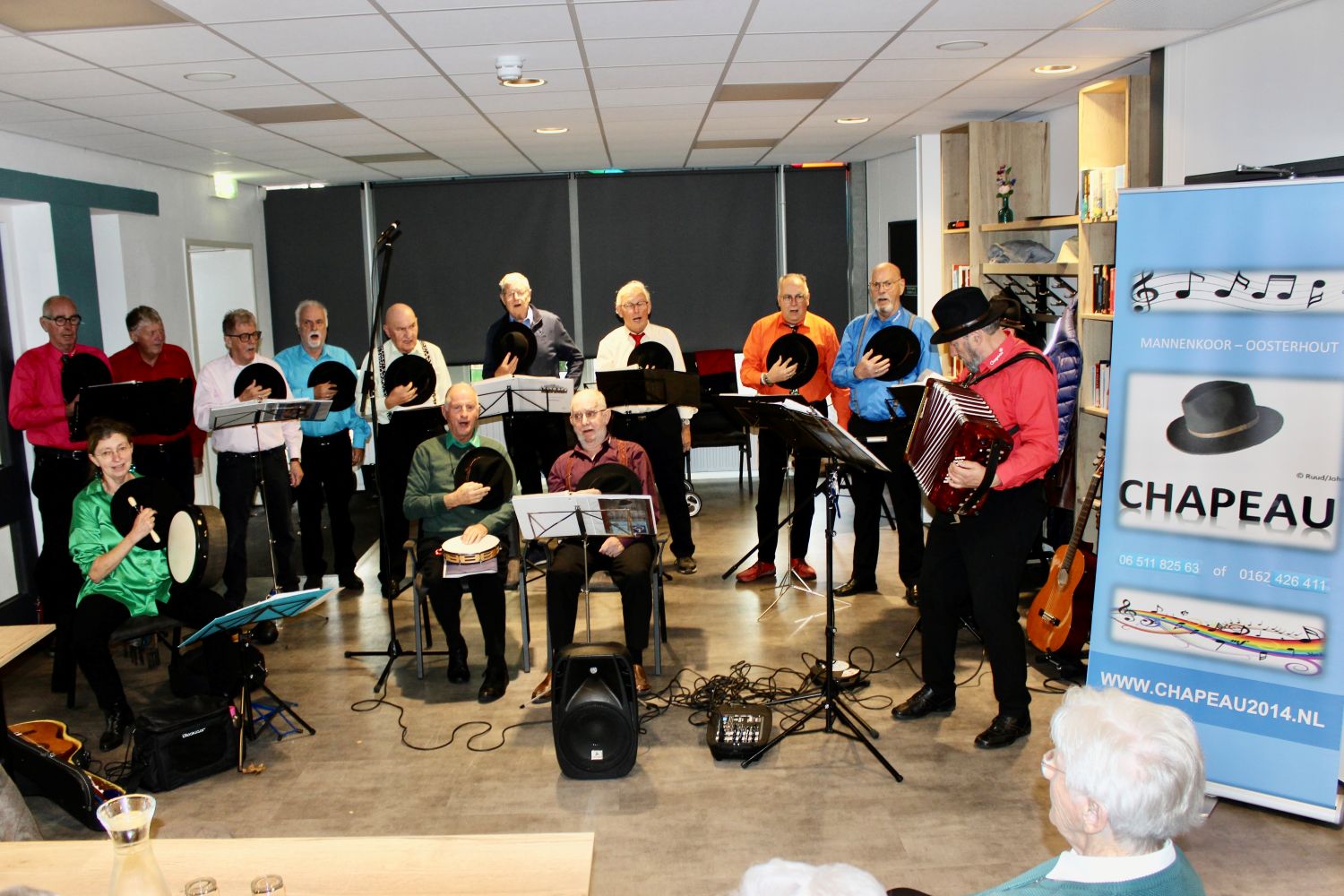 Om 14.00 uur begon het muzikale hoogtepunt van de dag: het Oosterhoutse Mannen Ensemble ‘Chapeau’ trad op. Het ensemble bracht een gevarieerd repertoire met gezellige, vrolijke, maar ook melancholieke en gevoelige liederen. De sfeer zat er goed in: er werd volop meegezongen en meegeklapt. Sommige liederen riepen herinneringen op aan vroeger, wat zorgde voor ontroerende momenten. Het ensemble wist de zaal te raken en bracht een glimlach op het gezicht van veel aanwezigen.