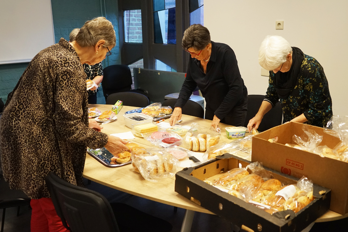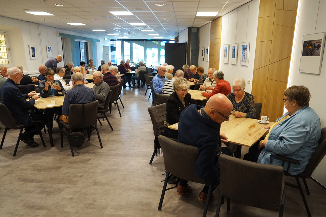 Om kwart voor tien heeft iedereen z’n plek aan een tafel gevonden en wenst Piet iedereen een fijne wedstrijd. Mieke en Elly, de dames van de ‘bediening’ hebben iedereen inmiddels van koffie of thee voorzien, gevolgd door Eduardo met een schaal met plakjes cake.